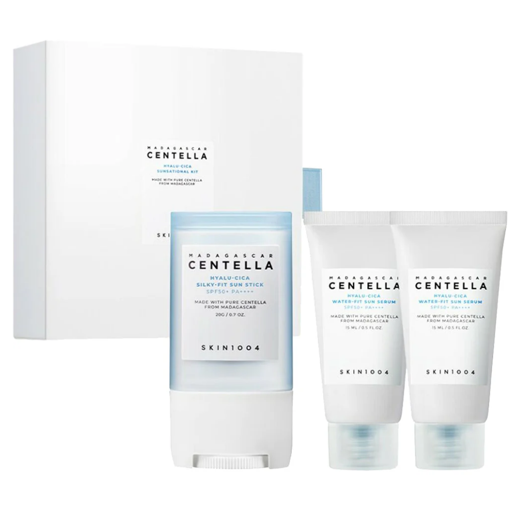 The SKIN1004 Madagascar Centella Hyalu‑Cica Sunsational Kit is a travel-friendly sun care set designed to protect, hydrate, and soothe the skin while shielding it from harmful UV rays. The kit features the Hyalu-Cica Water-Fit Sun Serum and the Hyalu-Cica Silky-Fit Sun Stick, both formulated with Centella Asiatica extract and hyaluronic acid to calm irritation and maintain deep moisture.